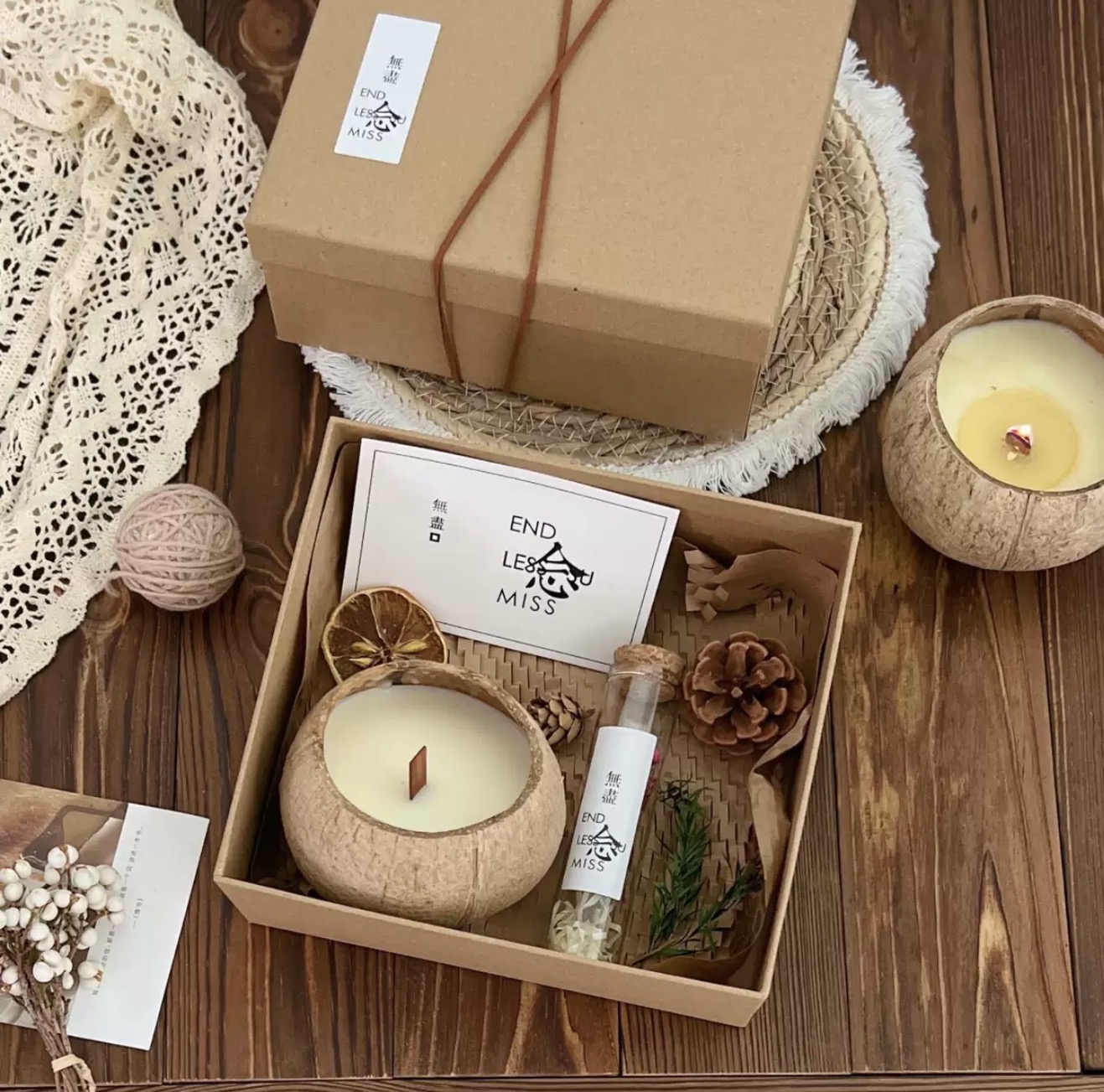 • 產品內容: 椰殼香氛蠟燭 x1、裝飾果乾、品牌風格掛卡、質感牛皮禮盒包裝。